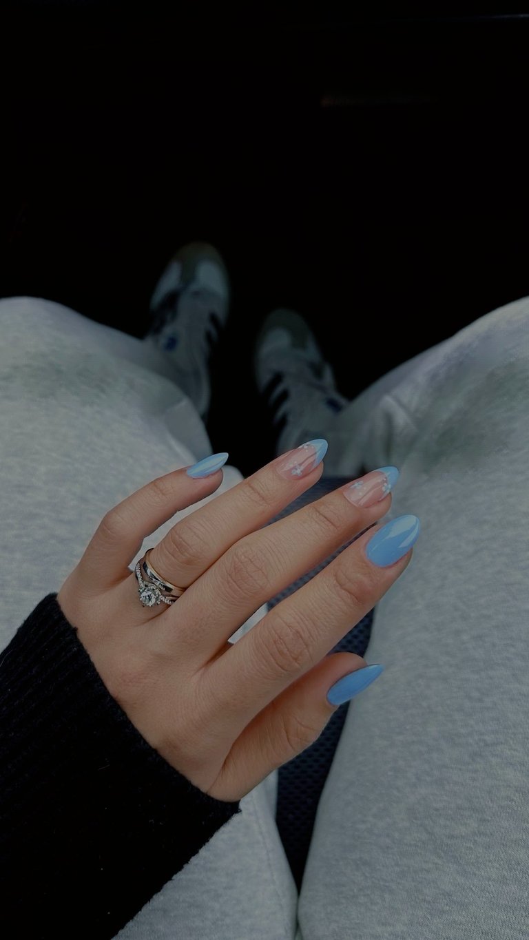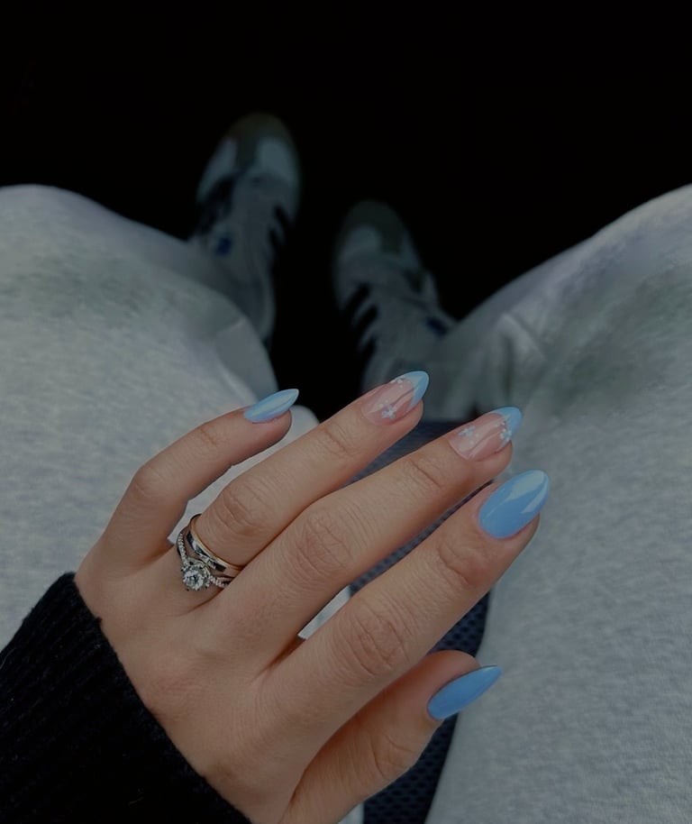 As March rolled in, signaling the start of spring, I was back at Alexandra's, ready for something a bit more daring. This time I chose a pastel blue that reminded me of Italy's gorgeous, clear skies—a real pick-me-up during the seasonal shift. They added small, fluffy white flower designs that popped against the blue, playful like the little clouds you see on a sunny spring day.